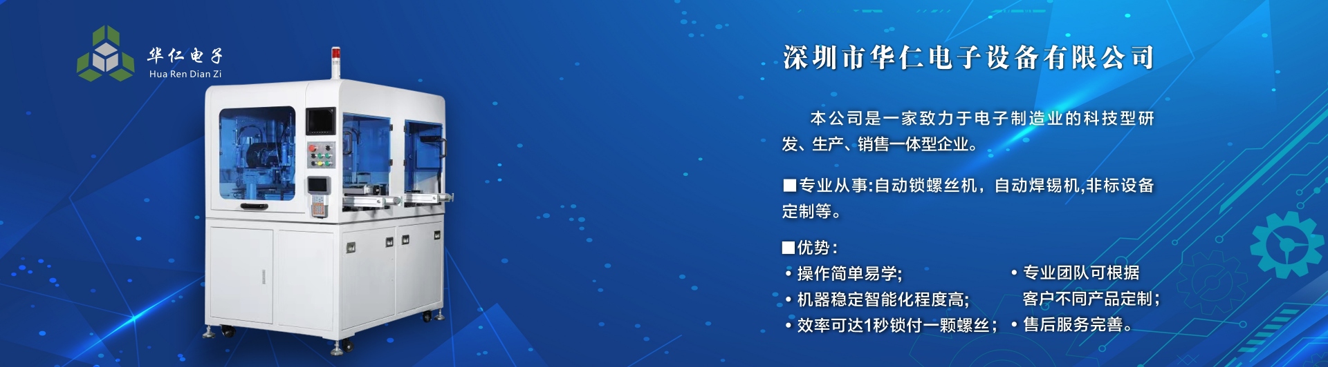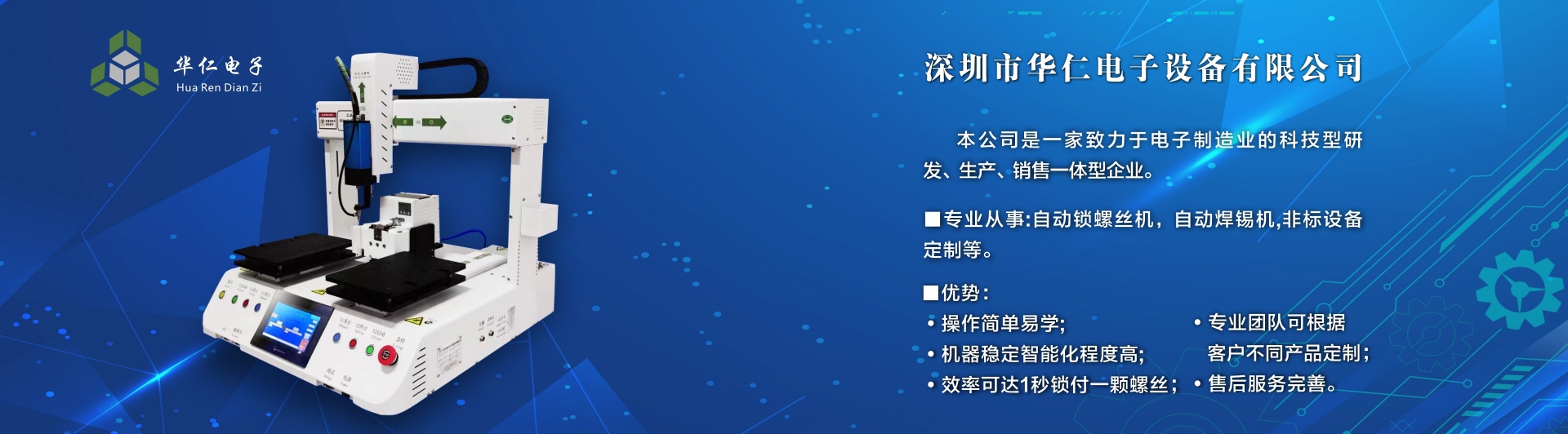 深圳市華仁電子設(shè)備有限公司是一家致力于電子制造業(yè)周邊設(shè)備的科技型研發(fā)、生產(chǎn)、銷(xiāo)售一體的企業(yè),專(zhuān)業(yè)從事:自動(dòng)鎖螺絲機(jī);自動(dòng)焊錫機(jī);非標(biāo)設(shè)備定制機(jī)等,公司長(zhǎng)期以來(lái)在行業(yè)中積累了豐富的經(jīng)驗(yàn),擁有專(zhuān)業(yè)的研發(fā)、技術(shù)、銷(xiāo)售支持工程團(tuán)隊(duì)、各高級(jí)技術(shù)人才為客戶(hù)提供優(yōu)質(zhì)產(chǎn)品和服務(wù),同時(shí)不斷吸取國(guó)內(nèi)外先進(jìn)技術(shù),更準(zhǔn)確及時(shí)地為客戶(hù)提供優(yōu)質(zhì),性?xún)r(jià)比高的產(chǎn)品、公司以專(zhuān)業(yè)的售前、售中、售后服務(wù)贏得了客戶(hù)的信賴(lài)和好評(píng),為客戶(hù)提供先進(jìn)自動(dòng)化設(shè)備一體式解決方案、
